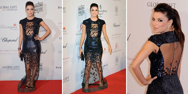 Eva Longoria erschien in einem mit blauen Pailletten besetzen Kleid, mit unvorteilhaften „Cut-Outs“ und einem viel zu langen durchsichtigen Rock.