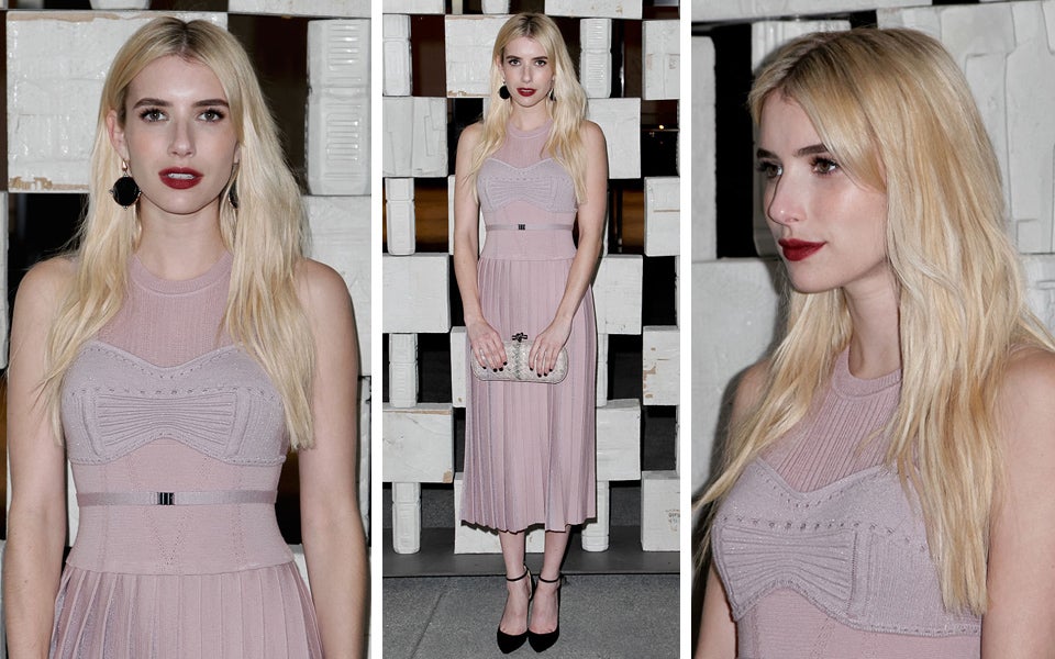 Emma Roberts ist in den letzten Jahren zu einer richtigen Stilikone aufgestiegen. Denn egal ob elegant auf dem roten Teppich oder lässig auf der Straße, die 25-Jährige weiß einfach wie man die neuesten Trends gekonnt umsetzt. So auch während ihres jüngsten Auftritts bei einer Gala in L.A. Für den Anlass zeigte sich die Nichte von Julia Roberts in einem wunderschönen altrosa Kleid von Bottega Veneta, das durch Applikationen im Korsettstil besticht. Ein Trend der gerade auf den Laufstegen in Paris von mehreren Designern für die neuen Kollektionen umgesetzt wurde. Dazu kombiniert sie schwarze Riemchen-Pumps von Jimmy Choo und eine helle Box-Clutch, die perfekt zum Kleid passt. Doch überraschend war der dunkelrote matte Lippenstift, den sie zu dem Look trug. Obwohl das nämlich normalerweise ein Fauxpas in Kombination mit dem romantischen Kleid wäre, zeigt uns Emma, dass man keine Angst vor mutigen Farbkombinationen haben muss, wenn man es so dezent macht wie sie. Heraus kam ein romantischer Look, der durch die dunklen Lippen das gewisse Extra erhält. Nur weiter so!