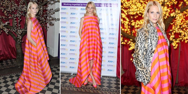 Beim "Sugarplum Ball" in London zeigte sich die Fashionista in einem knalligen pink-orange gestreiften Kleid,das eher einem Zelt glich. Auf den ersten Blick könnte man fast annehmen, dass das Model etwa einen Babybauch unter dem weiten Kleid versteckt. Der weite Schnitt ist leider alles andere als schmeichelhaft, die zierliche Blondine geht dabei komplett unter. Das quergestreifte Muster gibt dem überladenen Look den Rest. Damit nicht genug: als zusätzlichen Eyecatcher kombinierte Poppy dazu eine Jacke mit Leopardenmuster.