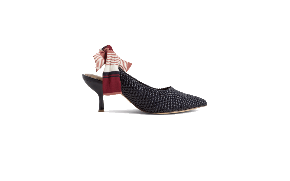 Bei diesem Schuh treffen gleich mehrere Trends aufeinander: Flechtwerk, ein nach innen gebogener Stilettoabsatz und ein ganz besonderes Slingback-Element an der Ferse. Mit einem geknotetem Tuch wird der Pump am Fuß fixiert. Das versprüht Vintage-Vibrations und macht so richtig Lust auf Sommer. Die Farbkombi aus Navyblau, Rot und Weiß eignet sich hervorragend für die Frühlingsgarderobe. Style-Bonus: Slingbacks bleiben auch heuer einer der größten Schuhtrends!