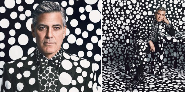 George Clooney ohne Smoking ist kaum vorstellbar. Seine Lieblingsgarderobe trug der beliebteste Junggeselle Hollywoods nun einmal anders: gepunktet. Für die Kunst-Ausgabe des W-Magazine ließ er sich vor gepunktetem Hintergrund der Künstlerin Yayoi Kusama ablichten. Der Anzug mit Punkte-Muster in schwarz-weiß wurde von niemand geringerem als Giorgio Armani designt.