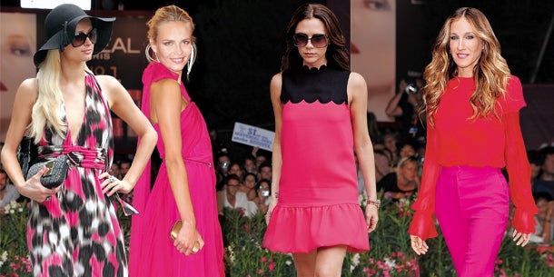 Mal lässig wie Jessica Capshaw in nudefarbenen Hot Pants zu pinkem Top. Dann wiederum sehr glamourös, in großer pinker Abendrobe mit goldenen Accessoires an Topmodel Natasha Poly. Oder auch ganz dezent getragen von Rose McGowan im kleinen Schwarzen zur Clutch in feurigem Fuchsia. Die heißeste Kombi? Sarah Jessica Parker in Knallrot zu Neonpink!
