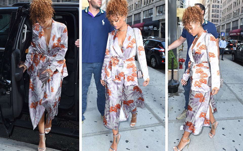 Der Pyjama ist mittlerweile salonfähig, also warum nicht auch der Bademantel?! Rihanna war am Wochenende als Hochzeitsgast zur Trauung ihrer Stylistin Sonya Benson geladen - und für diesen Anlass zog sie etwas ganz Besonderes aus dem Kleiderschrank hervor. Im taubengrauen Morgenmantel erschien sie zur Hochzeit. Asiatische Blüten zierten die schimmernde Seite, welche Rihanna klugerweise mit kühlen Accessoires kombinierte. Die violette Metallic-Henkeltasche von Dior ist das zweite Highlight dieses Looks. Nur die Haare hätten etwas mehr Styling vertragen: Eine Hollywood-Mähne oder ein Chignon wären die festlichere Frisurwahl gewesen. Und auch bei den Ärmeln des Kleides drücken wir ausnahmsweise ein Augen zu: zwei, drei Zentimeter hätten man sie kürzen können... Dennoch: Top!