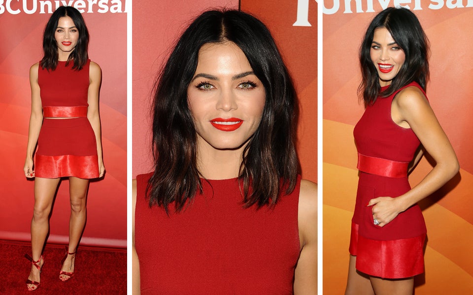Monochrom ist in! Vor allem für die kommende Saison setzen viele Designer wieder auf farblich abgestimmte Looks, die gleichzeitig raffiniert und elegant wirken. Für den „NBCUniversal Summer Press Day“ entschied sich Jenna für einen weinroten Zweiteiler, bestehend aus Crop Top und Minirock. Das Ensemble wartete mit raffinierten Colorblock-Details in knalligem Rot auf und betonte die sportliche Figur der 36-Jährigen perfekt. Zu dem sexy Look kombinierte die Tänzerin und Schauspielerin farblich passende High Heels mit Satinschleifen. Auch das Make-up wählte Jenna passend zur Farbe des Outfits, was den Look perfekt abrundete.