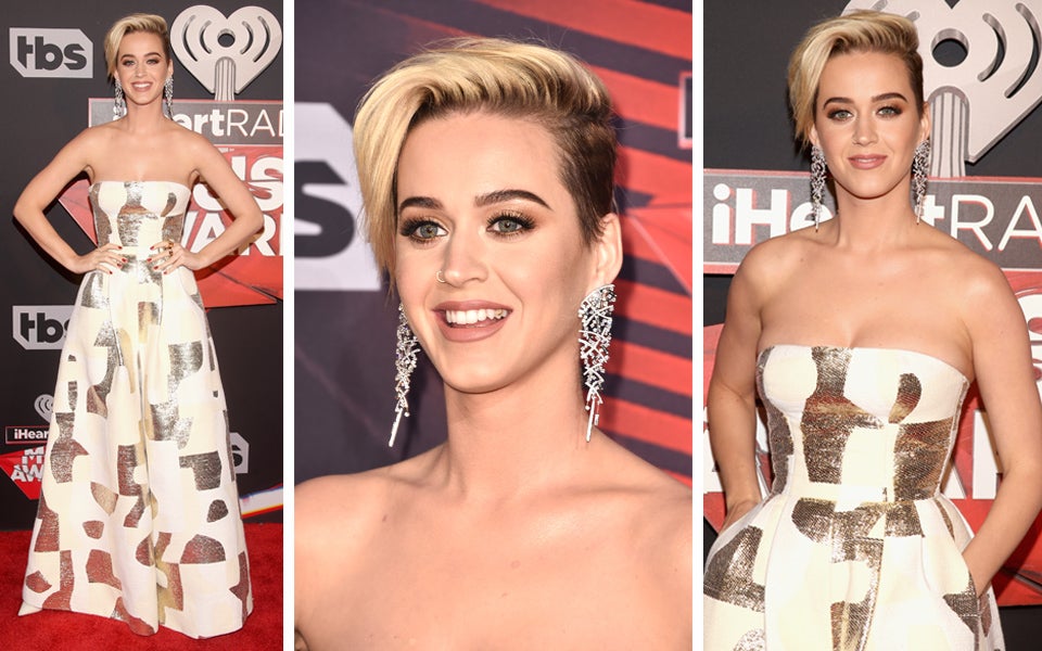 Bei den iHeartRadio Music Awards am Sonntag in Kalifornien zeigte sich Katy Perry strahlender denn je. Mit Miley Cyrus-Gedächtnisfrisur erschien sie auf dem roten Teppich und stahl den anderen Gästen die Show. Tatsächlich war diese auch das Vorbild für die neue Frisur, wie sie einen Reporter sagte: „Ich wollte immer wie Miley Cyrus aussehen. Ich wollte immer diesen Pixie-Cut, also habe ich zu meinem Stylisten gesagt: ‚Lass es uns einfach tun‘.“ Doch nicht nur ihre neue Frisur war an diesem Abend ein echter Hingucker. Denn für die Veranstaltung hatte Katy auch noch ein aufregendes Outfit parat. Die Sängerin erschien in einem schulterfreien Jumpsuit mit schimmernden Gold-Elementen und extrem weiten Beinen von Designer August Getty. Der Clou: Der raffinierte Jumpsuit sah eigentlich aus wie eine elegante Robe. Nur beim Gehen wurde sichtbar, dass es sich bei dem Kleid unten eigentlich um Hosenbeine handelt. Einfach nur cool!