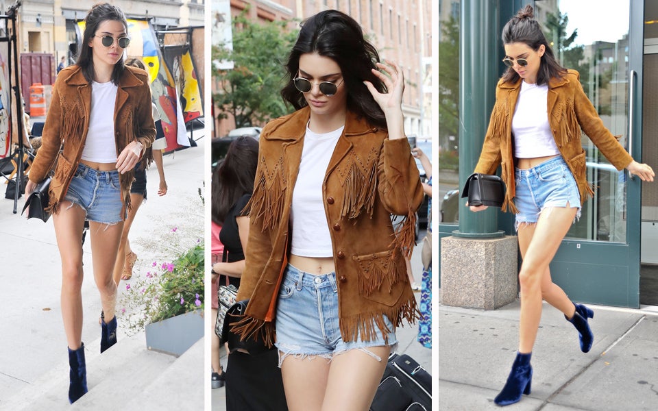 Die 20-Jährige, die unlängst auf dem Laufsteg der grandiosen Fendi Fashion-Show am berühmten Trevi-Brunnen zu sehen war, zeigt uns in ihrem neuesten Outfit nicht nur aktuelle Sommertrends sondern greift sogar dem Trendbarometer schon voraus. Denn neben angesagten Jeansshorts und einer Lederjacke mit Fransen, zeigt Kendall uns auf New Yorks Straßen wie man den kommen Herbsttrend, nämlich Samtbooties, schon bei warmen Wetter ausführt. Dazu die Haare locker zu einem Half-Bun aufgesteckt, eine runde Sonnenbrille aufgesetzt und der Look ist sofort sommertauglich!