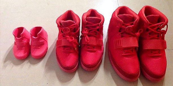 Ein Familienfoto der etwas anderen, aber ganz besonders herzigen Art postete Kim Kardashian (33) auf Instagram. Darauf zu sehen: Drei Paar rote Schuhe des Modells Air Yeezy 2, ordentlich nebeneinander aufgestellt. Die Schuh-Wahl ist kein Zufall, handelt es sich doch um eine Kollaboration zwischen Kanye West (36) und der Marke Nike. Eine bessere Promotion als seine eigene Familie mit dem Modell auszustatten, hätte der Rapper nicht finden können.