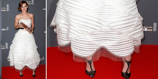 Eines vorweg: An sich ist das Chanel-Kleid, das Kristen Stewart bei der Verleihung des 'Césars' trug ein Traum. Fein verarbeitetes Seidenorganza mit ordentlichem Volumen im Rockteil. Das Problem: Die unmögliche Länge. Gepaart mit den strappy Mary Janes wird die Figur der Schauspielerin um ein gefühltes Drittel gestaucht. Die Silhouette gleicht einer Glocke, die auf beide Seiten ausschlägt. Auch die Ähnlichkeit mit einer Gans lässt sich nicht verleugnen – welcher Stylist hat Kristen dieses böse Fashion-Experiment verschrieben.