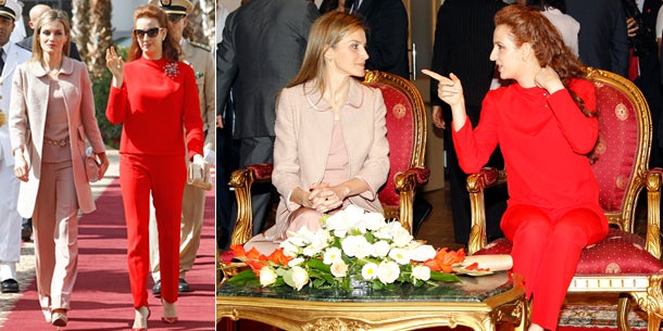 Am Weg zur Brustkrebsklinik machen beide Ladys im Hosenanzug eine elegant-zurückhaltende Figur. Letizia trug eine rosé farbene Marlene-Hose zum gleichfarbigen Oberteil. Bei den Accessoires ging die spanische Königin ebenfalls auf Nummer sicher und wählte schlichte Clutch und Peeptoes in Nude. Zwar wirkte Letizia neben der Gastgeberin Prinzessin Lalla Salma, im All-Over-Red-Look, ein wenig farblos, aber dadurch nicht weniger adrett.