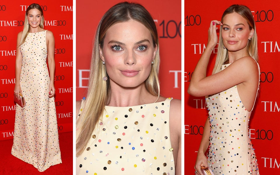 Für die „Time 100 Gala“ in New York, bei der die einflussreichsten Menschen des Jahres gefeiert werden, zählte Margot Robbie zu den wohl schillerndsten Gästen an diesem Abend. Nicht nur, dass die Australierin zu einer der einflussreichsten Persönlichkeiten des Jahres ernannt wurde, sondern sie hatte in ihrem Kleid auch einen der glamourösesten Auftritte des Abends. In einer bodenlangen cremefarbenen Robe von Prada, die über und über mit bunten Edelsteinen verziert war, verzauberte die 26-Jährige auf dem roten Teppich. Zu dem eleganten Kleid kombinierte die Schauspielerin eine zartrosa Clutch und filigranen Goldschmuck von Delfina Delettrez. Ihr Haare trug die Aktrice offen im Sleek-Look und wählte zu der aufregenden Robe nur dezentes Make-up.