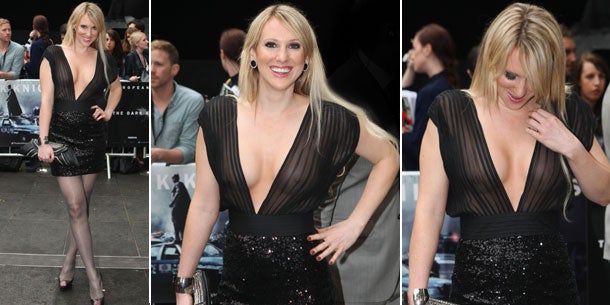 Denn genau diese Damen sorgen immer wieder für peinliche Schlagzeilen. Oft wird mit den viel zu kurzen, zu engen, zu kleinen, zu transparenten Kleidern die Aufmerksamkeit der Fotografen gesucht – und die Taktik geht auf! Schon so manche Busenblitzerin wurde auf diese Weise, zumindest kurzzeitig, bekannt. Den Versuch machte nun auch die englische Schauspielerin Rebecca Ferdinando bei der Europa-Premiere von "The Dark Knight Rises" in London. Man kennt sie vielleicht aus Filmen wie "Bonded by Blood" oder "X-Men First Class". Mit ultraknappem, schwarzem Minikleid, extrem tiefem Dekolleté und wenig Stoff, der ihre Oberweite hätte bedecken sollen (es aber nicht tat) posierte die Blondine für die Fotografen.