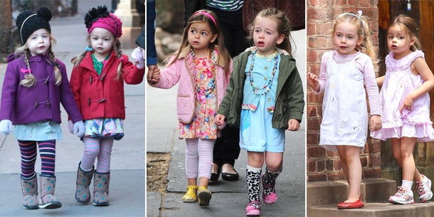 Die beiden suchen sich ihre Kleider nämlich gerne selbst aus, was die eine trägt, will die andere auch – oft sieht man sie in gleichen Outfits. Ganz wie die Serienfigur ihrer berühmten Mutter, Carrie Bradshaw, begehen auch die Zwillingsmädchen gerne Stilbrüche bei ihren Kombinationen, tragen Mustermix, Regenboots zu süßen Kleidchen oder auch manchmal nur eine Socke statt zwei. Täglich führen sie ihre Outfits den Fotografen, die vor ihrem Haus in New York auf sie waren stolz vor und man kann jetzt schon sehen, dass ihnen die Leidenschaft für Mode quasi in die Wiege gelegt wurde. Suri Cruise, Harper Beckham & Co – aufgepasst, jetzt kommen die Broderick-Twins!