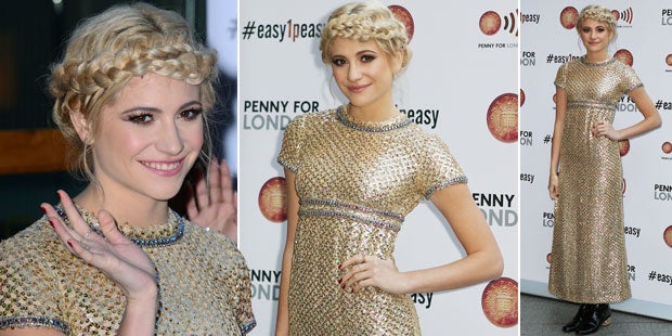 In dem knöchellangen, in Gold und Silber schimmernden Kleid war die 23-Jährige nicht zu übersehen. Ihre blonde Mähne hatte Pixie Lott zu zwei Zöpfen geflochten und wie einen Kranz um ihren Kopf gebunden. Der feine Goldschmuck und ihr roter Nagellack rundeten das festliche Outfit ab. Nur die geschlossenen, flachen Lackschuhe mit den goldenen Absätzen sahen irgendwie eigenartig aus. Hübsche Stilettos hätten zu dem Kleid bestimmt besser gepasst.