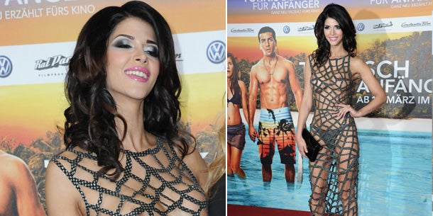 Auf einen roten Teppich einer Filmpermiere, würde man meinen, kommen glamouröse Roben und hin und wieder der ein oder andere Flop. Aber Freizeit-Nudistin Micaela Schäfer (28) musste es wieder einmal übertreiben und erschien zur Premiere von „Türkisch für Anfänger“ in München in einem "Kleid" das einem Fischernetz glich. Mit Strasssteinchen besetzt wurde hier noch ein wenig am Glamour-Faktor gearbeitet und der Hingucker des „Kleides“ waren zwei Nippelwärmer.
