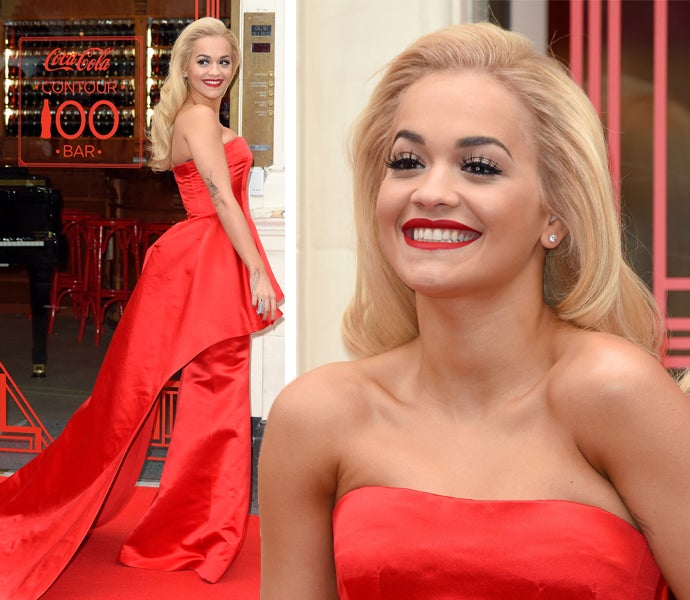 Rita Ora wird ihrer Rolle als Coca Cola-Testimonial absolut gerecht. Zur 100-Jahre-Feier in London erschien die Sängerin in einer atemberaubenden Satinrobe, die farblich perfekt auf das Etikett der weltberühmten Flasche abgestimmt war. Das Bustierkleid ähnelte auch in seiner Form der Silhoutte des Cola-Bottle: Obenrum enganliegen, nach unten weit ausfallen. Das Schößchen verlieh dem Look einen zeitgemäßen Touch. Auch das Styling stimmte: Zur blonden Diven-Mähne trug Rita blutroten Lippenstift und Nagellack.