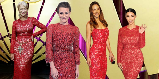 Bei athletischen Frauen mit weniger Kurven wie Hilary Swank oder Stacy Keibler, zaubert eng anliegender, roter Spitzestoff tolle Rundungen und sorgt für Sexappeal-Faktor, bei Frauen wie Kim Kardashian hingegen setzt er sie nur noch besser in Szene. Jüngere Stars wie Lea Michele (27) oder Sängerin Taylor Swift (23) tragen die verspielte und romantische Variante mit schwingendem Rockteil. Aber auch reifere Damen wie Kris Jenner (58) können rote Spitze unbesorgt tragen, denn als Blickfang kaschiert es unauffällig ein paar Problemzonen. Helen Mirren bewies mit ihren 68 Jahren, dass sie genau das gleiche rote Spitzenkleid von Gucci tragen kann wie die 46 Jahre jüngere Sängerin Rita Ora.