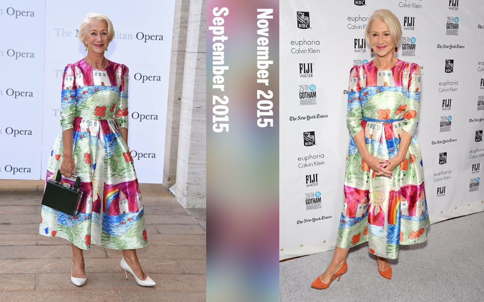 Bereits im September trug Dame Helen Mirren dieses kunterbunte Kleid von Dolce & Gabbana. Jetzt immer November kombinierte sie das selbe Kleid mit neuen Accessoires und sah dabei ebenso hinreißend aus.