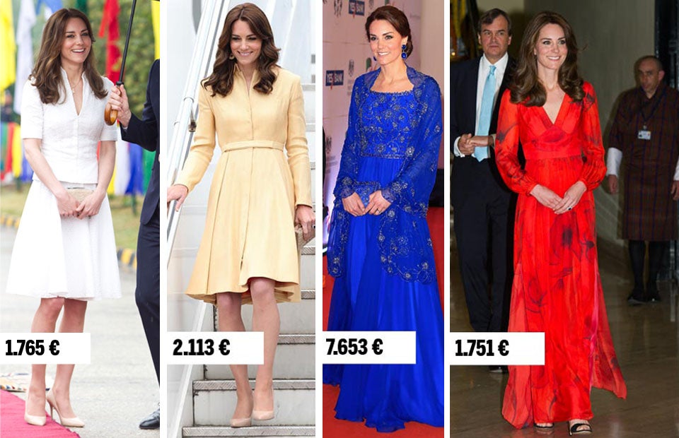 Ankunft in Paro: Mantelkleid von Emily Wickstead, Sonderanfertigung für Kate, 1.700 $ Pumps in Nude von LK Bennett, Kates ständige Dauerbegleiter, 345 $ Strohclutch von LK Bennett, schon früher von Kate getragen, 295 $ Ohrringe von Brora, 55 $ Insgesamt 2.395 $, umgerechnet circa 2,113 € Beim Bogenschießen: Top von Paul & Joe, 520 $ Traditioneller, handgewebter Rock aus Buthan, 1.500 $ Pumps in Nude von LK Bennett, Kates ständige Dauerbegleiter, 345 $ Ohrringe von Kiki McDonough, 5.500 $ Insgesamt 7.865 $, umgerechnet circa 6.939 € Dinner mit König und Königin von Buthan: Kleid von Tory Burch, 1.550 $ Pashmina von John Lewis, 30 $ Criss-Cross Sandalen von Gianvito Rossi, wiederholt getragen, 835 $ Ohrringe von Brora, wiederholt getragen 55 $