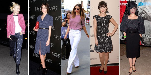 Wir haben uns bei den Stars umgesehen und für sie nachgeshoppt. Besondere Punkteliebhaberinnen sind Miranda Kerr, deren Augenmerk auf Blusen liegt und Alexa Chung, die man schon seit fast zwei Jahren immer wieder in gepunkteten Outfits sieht. Nachdem die Schönheit die Fashionista Nummer Eins ist und uns bald auch mit einer eigenen Modelinie beschenkt (wir berichteten), war hier schon ein Trend absehbar. Auch Gwen Stefani, das Rockabilly-Aushängeschild liebt Punkte. Wir wissen nicht, ob die rosa Lederjacke mit gepunkteten Jeans oder doch das hellgrüne Retro-Punktekleid mit weinroten Heels unser Liebling ist.