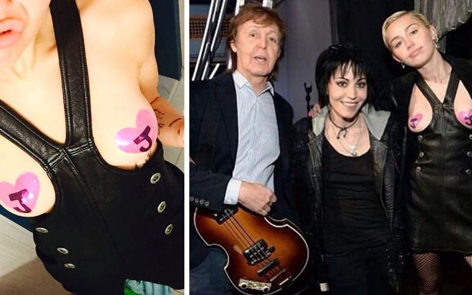 Smiley war nicht nur Laudatorin, sondern ist auch großer Fan, und zeigte das mit einem Look, der ihre Brüste unbedeckt ließ und den Blick auf Nippelpasties mit den Initialien von Joan Jett frei gab. Abgerundet wurde der Look von wild wuchernden Achselhaaren.