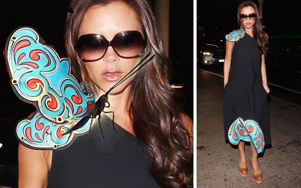 Doch leider ist auch Victoria nicht vor so mancher Geschmacksverwirrung gefeit. Letzte Saison versuchte sie die Strenge ihrer monochromatischen Looks mit bunten Elementen zu brechen - und griff dabei etwas zu tief in den Farbtopf. Asymmetrische Looks mit XXL-Applikationen in Comic-Optik waren das Endergebnis. Am Flughafen in LA wurde Victoria nun in einer diesen Kreationen gesichtet: das schwarzes A-Linien Kleid mit türkisem Schmetterlings-Muster wird wohl kaum ein Renner werden... Immerhin geht Victoria als Freiwillige vor und trägt ihre Flop-Designs selbst...