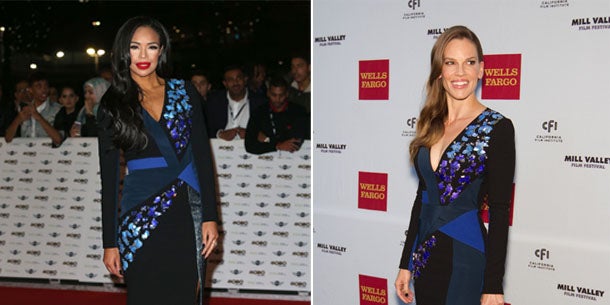 Schauspielerin Hilary Swank und BBC-Moderatorin Sarah-Jane Crawford trugen das blaue Colourblock-Dress von Peter Pilotto zum Glück auf verschiedenen Kontinenten in einem Abstand von zwanzig Tagen.