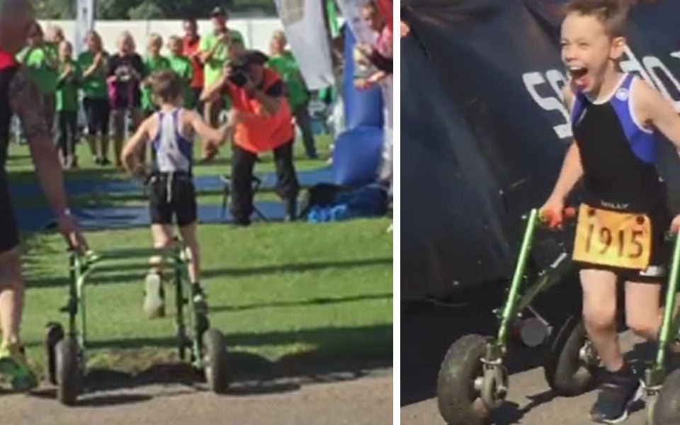 Der 8-jährige Bailey Matthews aus Nottinghamshire in Nord-England hat vielleicht Kinderlähmung, aber das hielt ihn nicht davon ab, einen Triathlon zu bezwingen!