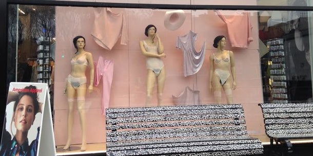 Ausgerechnet in den USA, wo Körperbehaarung bei Frauen wenig gut gelitten ist, setzt ein US-Textilunternehmen wieder auf "unten mit": Zur Freude oder zum Entsetzen der Passanten tragen in einem New Yorker Schaufenster die Puppen Schamhaare, und das reichlich - unter transparenter Unterwäsche ist deutlich ein dichter schwarzer Pelz zu sehen.