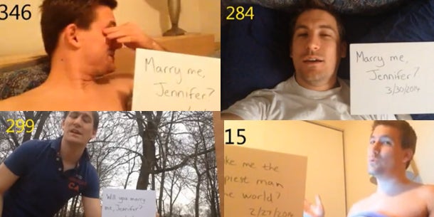 Ein Jahr lang hatte Jennifer nichts von dem kuriosen Heiratsantrag ihres Freundes Dean Smith bemerkt. Dieser ließ sich für seine Liebste etwas ganz Besonderes einfallen: 365 filmte er sich bei Alltagsaktivitäten und hielt eine Schild mit folgender Aufschrift in die Kamera: „Jennifer, willst du mich heiraten“ – versehen mit dem aktuellen Tagesdatum. Ein Jahr und 365 Video-Messages später kam es zum Liebes-Showdown. Gemeinsam mit Jennifers Familie fädelte er eine romantische Antrags-Party am Strand von Aruba ein. Mit dem Rücken zum Meer sah die umworbene Jennifer das Video zum ersten Mal. Dean näherte sich ihr von hinten an, kniete nieder und fragte die Frage aller Fragen…. Hach, wie romantisch!