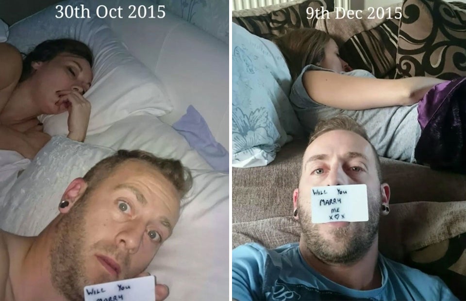 Auf diese Idee muss man erst einmal kommen. Der Brite Ray Smith hielt unglaubliche 149 Mal um die Hand seiner schwangeren Freundin Claire an. Warum so oft? Nicht etwa weil sie 'Nein' sagte, sondern weil sie schlichtweg nichts davon wusste. Der 38-Jährige knipste Selfies und Pärchenfotos und hielt ein kleines Schildchen in die Kamera, auf welchem folgendes stand: "Willst Du mich heiraten?".