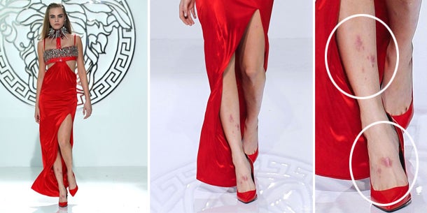 Bereits im Februar wurde ihr das zum Verhängnis. Die 21-Jährige lief für Versace in Mailand über den Catwalt, doch ihre Beine voller Schuppenflechte passten so gar nicht zu dem sonst so glamourösen Auftritt. Sogar Kate Moss schlug damals Alarm und alarmierte ihren Arzt. Doch gegen die chronische Krankheit ist jeder Arzt hilflos. Die Flecken kommen automatisch sobald die Opfer unter Stress stehen. Bei Shootings und Modeschauen werden Cara’s Schuppenflechte überschminkt. Doch oft sind sie zu stark! Das Cara unter der Krankheit leidet ist offensichtlich. So twitterte sie zum Beispiel kurz nach der Versace-Show „Be gone psoriasis, you’re no fun“ (Geh weg Psoriasis, es ist nicht mehr lustig).