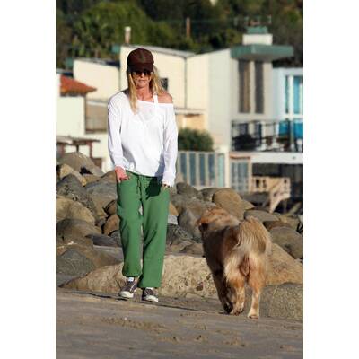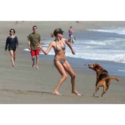 Gisele Bündchen hält sich durch Strandspaziergänge mit ihrem Hund fit.