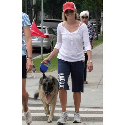 Reese Witherspoon führt ihren Hund vorschriftsmäßig an der Leine.