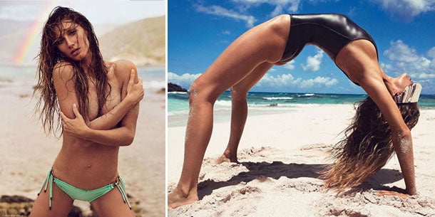 Am Cover entzückte sie mit ihrer Kehrseite, die ausser Sand fast nichts trug. Aber in der Foto-Strecke, für die sie eben für die französische Sommer-Vogue modelte, zeigt sie ebenso viel Haut. Von einem Babybauch sieht man nichts.
