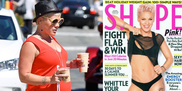 Die Schwangerschaft hinterließ auch bei ihr Spuren und bei einer Größe von 1m63cm nahm sie ganze 24kg zu. Auf gesunde Ernährung oder ein wenig Sport verzichtete die Sängerin und genoss all die Dinge, die ihr sonst verwehrt blieben, um auf der Bühne in Topform stehen zu können. "Wann wenn nicht in der Schwangerschaft?" war wohl auch ihr Motto: „Ich habe während der Schwangerschaft jede Menge Käsekuchen gegessen. Und alles andere, was süß und ungesund ist“, so Pink im Interview.