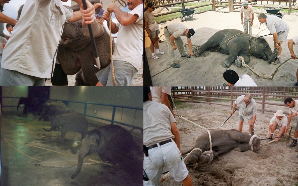 Kennt das Tier nur noch Angst und Schmerzen, beginnt das harte Training: Mittels Haken und Stricken werden die Elefanten zu ihren ‚Kunststückchen‘ gezwungen. Folgt das Tier nicht, werden die Metallspitzen in seine Haut gebohrt. Auf diese Art und Weise dressiert man die Elefanten zu Sitzkunststücke oder den Kopfstand. Ständige Kommandos begleiten die Tortur - so wird das Tier auf das Befolgen menschlicher Anweisungen konditioniert.