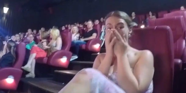 Diese junge Dame ahnte wohl kaum, dass ein Kinobesuch ihr Leben für immer verändern würde. Ihr Freund Nick heckte mit der Hilfe eines wiffen Radioteams einen Überraschungsantrag bei einem "50 Shades of Grey"-Screening aus. Statt den üblichen Trailern sprach Nick seine Freundin direkt von der Kinoleinwand an, um nur kurz darauf mit Ring und Blumenstrauß vor ihr auf die Knie zu gehen.