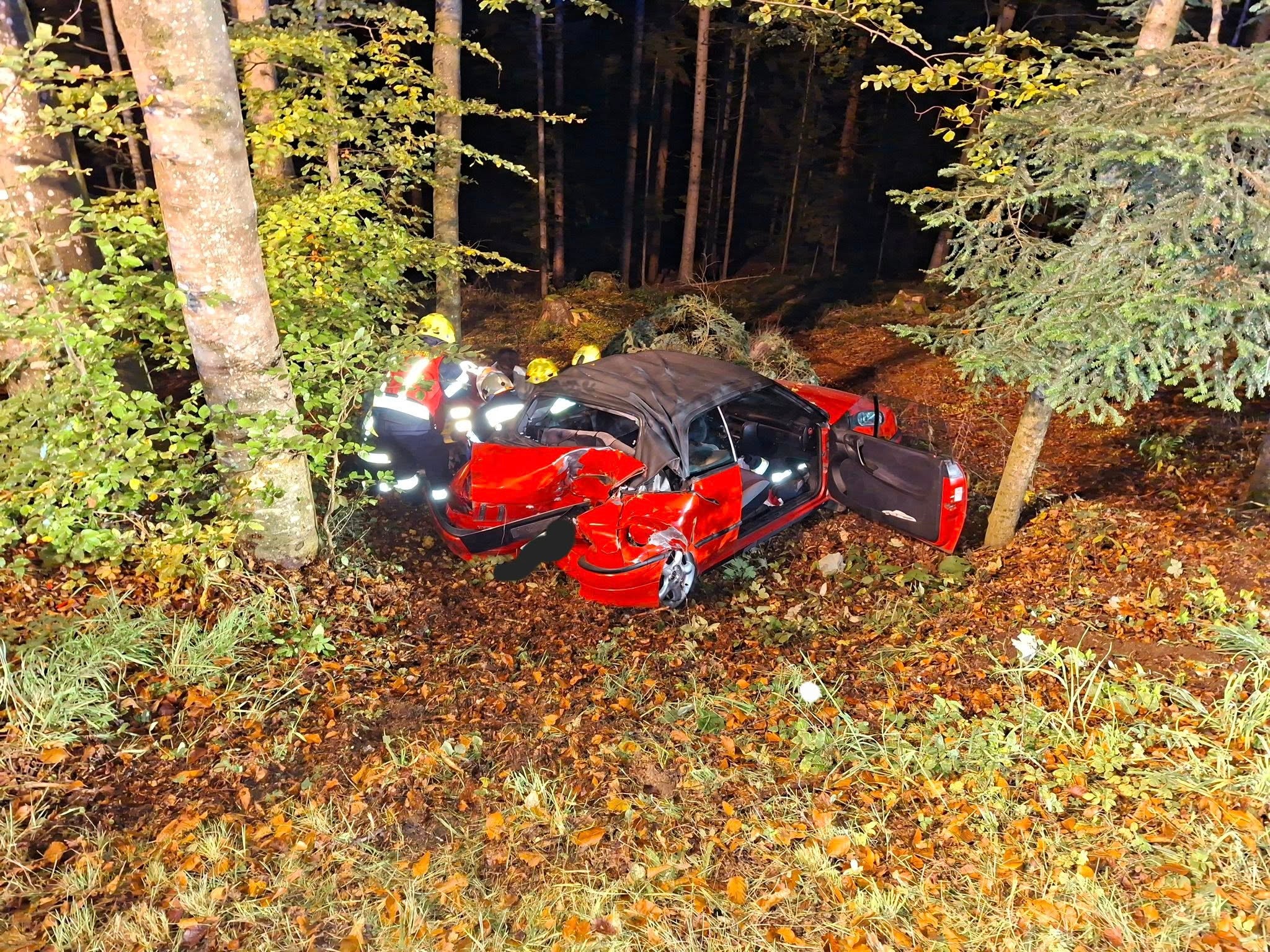 Beim Wiedereinordnen auf seinen Fahrstreifen geriet er mit den rechten Rädern seines Autos ins Bankett und verlor daraufhin die Kontrolle über sein Fahrzeug. Das Cabrio drehte sich einmal um die eigene Achse, schleuderte über die Straßenböschung in den angrenzenden Wald und prallte schließlich mit dem Heck voran gegen einen Baum.