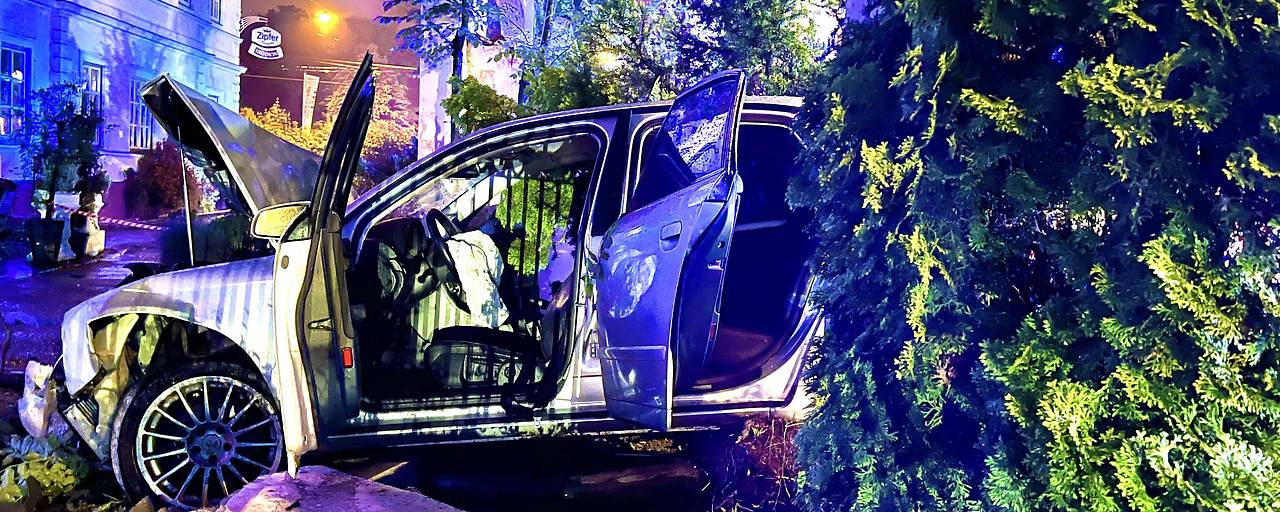 Das Fahrzeug überfuhr eine Verkehrsinsel, touchierte mehrere massive Betonpoller sowie Verkehrs- und Straßenschilder, berichtet der ORF. Anschließend durchbrach die silbergraue Limousine die Mauer des Gastgartens und kam auf dem Parkplatz des griechischen Restaurants zum Stehen.