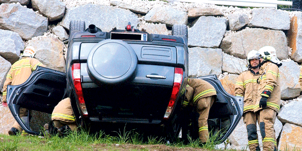 „Rund vier Meter tief fiel das Auto“, berichtet Einsatzleiter Gerhard Krenn von der Berufsfeuerwehr Linz. „Es schlug erst mit der Front am Boden auf und machte dann einen halben Salto, sodass es am Dach zu liegen kam.“