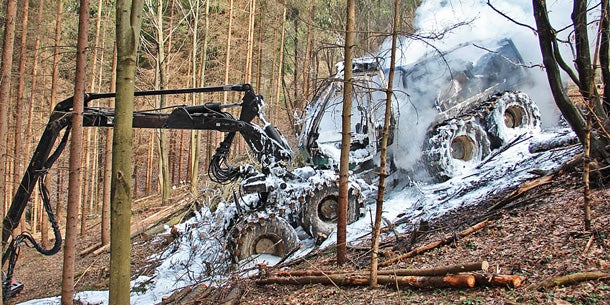Etwa zwei Stunden später wurden die Freiwilligen Feuerwehren Wernersdorf und Wies (Bezirk Deutschlandsberg) zu einem ungewöhnlichen Fahrzeugbrand gerufen: Als die 24 Helfer im Wald eintrafen, stand der Harvester bereits in Vollbrand. Der Maschinist habe laut Polizei noch versucht, mit einem Handfeuerlöscher gegen die Flammen vorzugehen, jedoch ohne Erfolg. Letztlich konnte trotz "massiven Schaumangriffs" nur noch ein Ausbreiten auf den Wald verhindert werden, hieß es seitens des Bereichsfeuerwehrverbands Deutschlandsberg. Das acht Jahre alte Forstgerät, das neu etwa 400.000 Euro kostet, wurde ein Raub der Flammen.