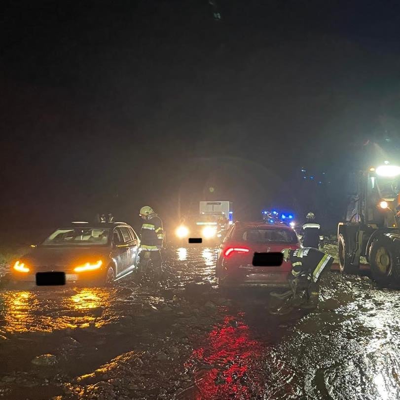 Im 30 bis 50 Zentimeter hohen Schlamm blieben 7 Pkw stecken. Die Fahrer, drei Beifahrer und vier Hunde wurden in den Fahrzeugen eingeschlossen, da sich die Türen nicht mehr öffnen ließen. Verletzt wurde zum Glück niemand. Die durchaus geschockten Betroffenen konnten mitsamt ihren Fahrzeugen aus der missliche Lage befreit werden.