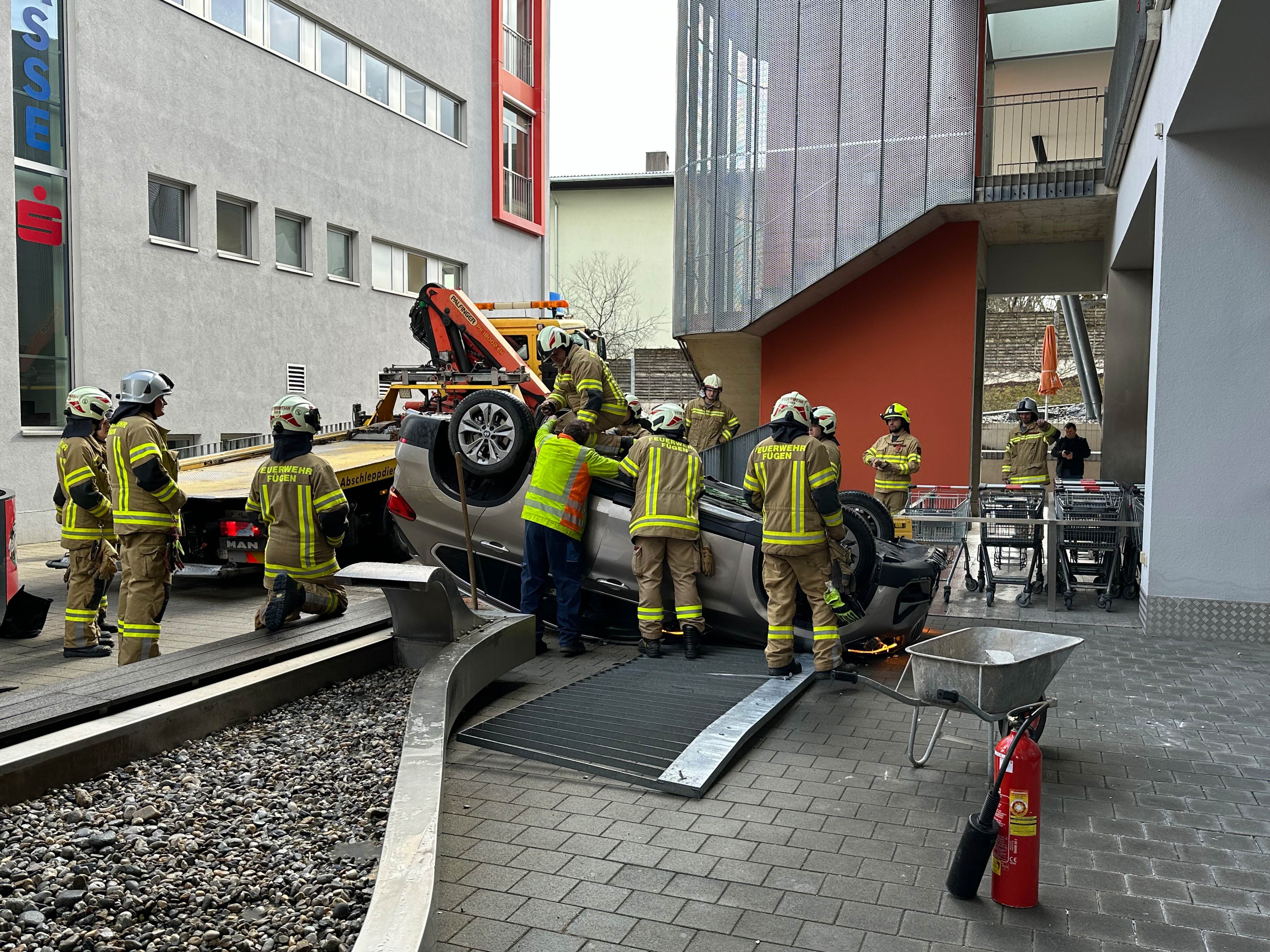 Mit seinem BMW-SUV stürzte ein 73-Jähriger in Fügen im Zillertal von einer Hochgarage aus direkt vor einen Supermarkt. Zum Glück waren gerade wenig Kundenverkehr. Der Lenker dagegen wurde schwer verletzt ins Spital gebracht.
