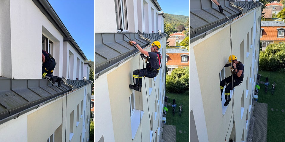 Da es sich um eine Hochsicherheitstür handelte, musste sich ein Höhenretter der Feuerwehr von der darüberliegenden Dachwohnung durch ein Fenster abseilen, runter- und durch ein zum Glück offenes Fenster in die Wohnung im 4. Stock klettern.
