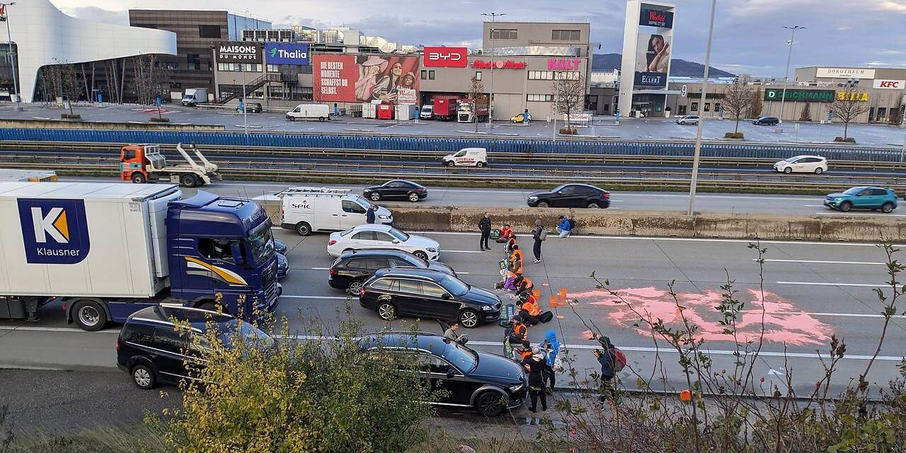 Auf Höhe der SCS auf der Südautobahn haben Aktivistinnen und Aktivsten am 20. November 2023 den Verkehr gestoppt.