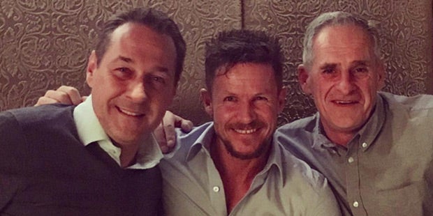Ein Foto zeigt den Extremsportler mit Strache bei einem guten Achterl Wein.