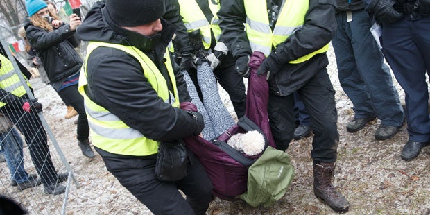 Die Verlegung des "Murcamps" verlief weitgehend ruhig. Immer wieder mussten aber Sicherheitskräfte einzelne Aktivisten aus dem Baustellengelände tragen. Die Kraftwerks-Gegner sprachen von gewaltsamen Übergriffen. Die Polizei dagegen meinte Freitagvormittag, dass es vorerst ruhig verlief: "Von Gewalt ist das weit entfernt", meinte ein Sprecher. Die Sicherheitskräfte dürfen auf Grundlage des "Hausrechts" die Demonstranten aus dem Areal tragen. Jene, die ihre Zelte am Ufer abbrechen mussten, verließen zum Teil weinend die Baustelle. Andere wiederum redeten den Sprecher der Energie Steiermark darauf an, ob ihm die gerodeten Flächen gefallen. "Es kommen wieder Bäume hierher", antwortete er, worauf es hieß: "Ja, kleine Fuzzi-Bäume."