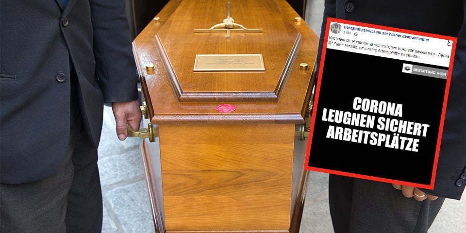 "Corona Leugnen sichert Arbeitsplätze", mit diesem Spruch sorgt die Bestattung Wien derzeit für Aufregung im Netz. Während es für die Werbung mit schwarzem Humor viele Likes gibt, können andere User mit dem Sarkasmus weniger anfangen. Für Aufmerksamkeit hat die Werbung jedoch gesorgt: Sie wurde auf Facebook bereits über hundert Mal geteilt.