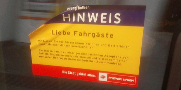 Wer in letzter Zeit in Wien mit der U-Bahn unterwegs war, staunte bei diesem Hinweisschild nicht schlecht: "Wir bitten Sie für Straßenmusikanten und Bettler immer ein paar Münzen bereitzuhalten."