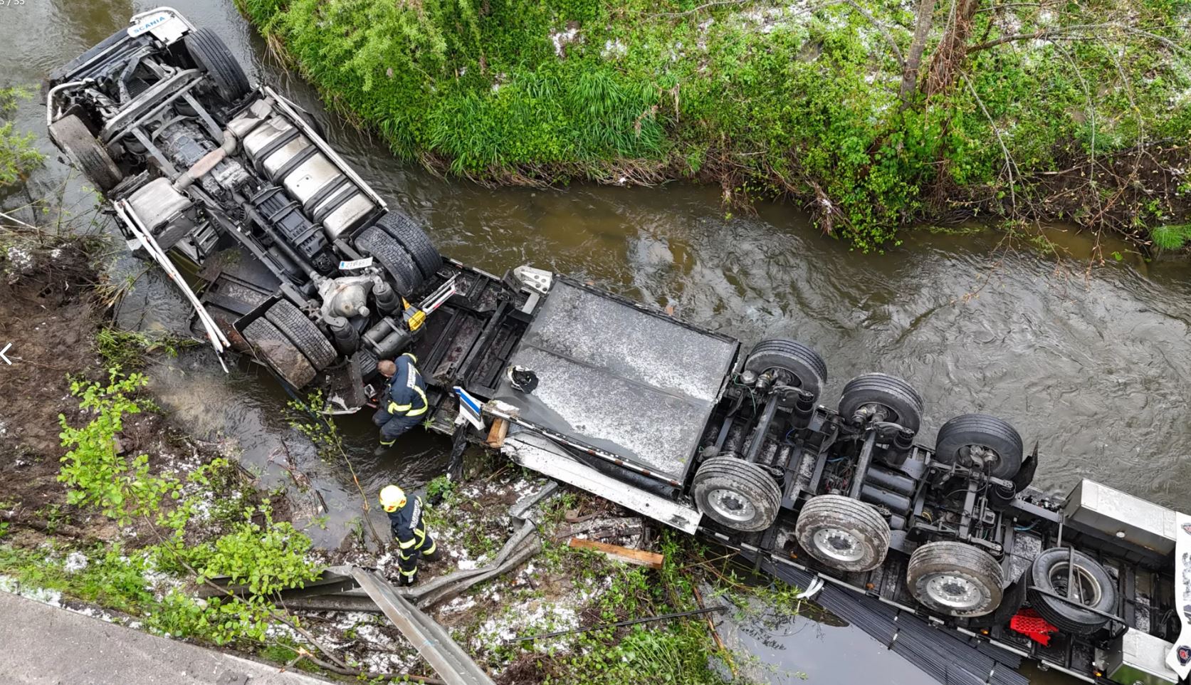NÖ. Es war Donnerstag gegen 15:00 Uhr auf der Gusental Landesstraße (L 1463) im Bereich Engerwitzdorf, als "Blitzschneefall" einsetzte, der einen Lkw-Lenker aus dem Bezirk Urfahr-Umgebung so sehr überraschte und überforderte, dass er mit seinem Sattelkraftwagen ins Schleudern kam und in das Bachbett der Großen Gusen stürzte.